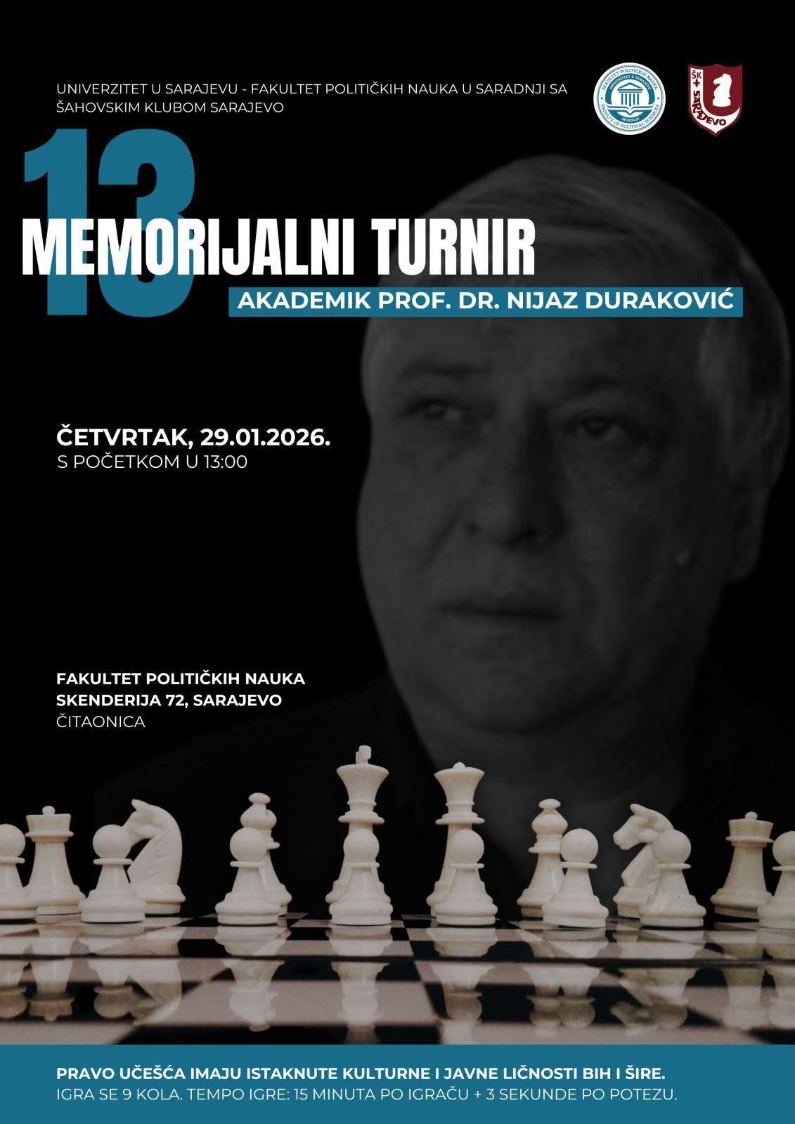 Fakultet političkih nauka Univerziteta u Sarajevu, u saradnji sa Šahovskim klubom Sarajevo, s ponosom organizira 13. Memorijalni šahovski turnir „Akademik prof. dr. Nijaz Duraković“, posvećen trajnom sjećanju na uglednog profesora Durakovića.
